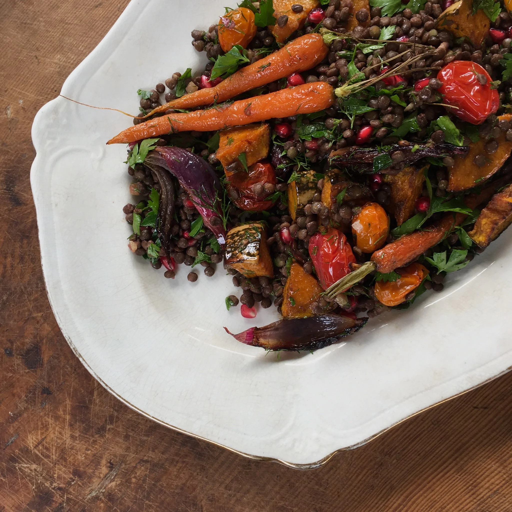 LENTILS AND ROAST VEGIES WITH PRESERVED LEMON DRESSING