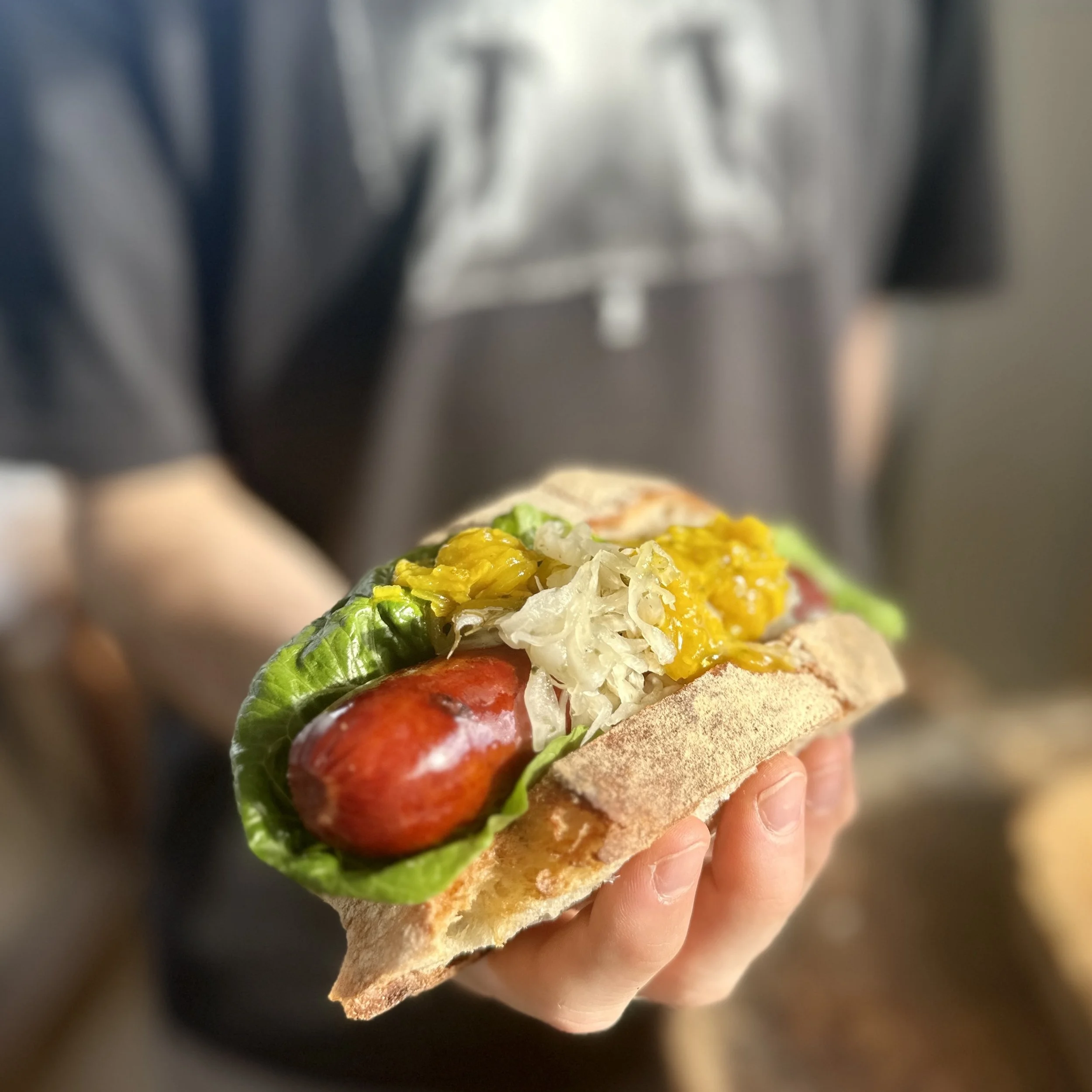 These smoky, spiced dolce sausages are already smoked and cooked, so you only need to warm them through (and scorch the skin a bit here and there for some visual and appetite appeal). This is a simple serving suggestion of sandwiching the smoky and spicy deliciousness with an assembly of sauces, pickle, fresh greens and kraut to create a flavour bomb. A great weekend bite for the kids or big kids at heart.