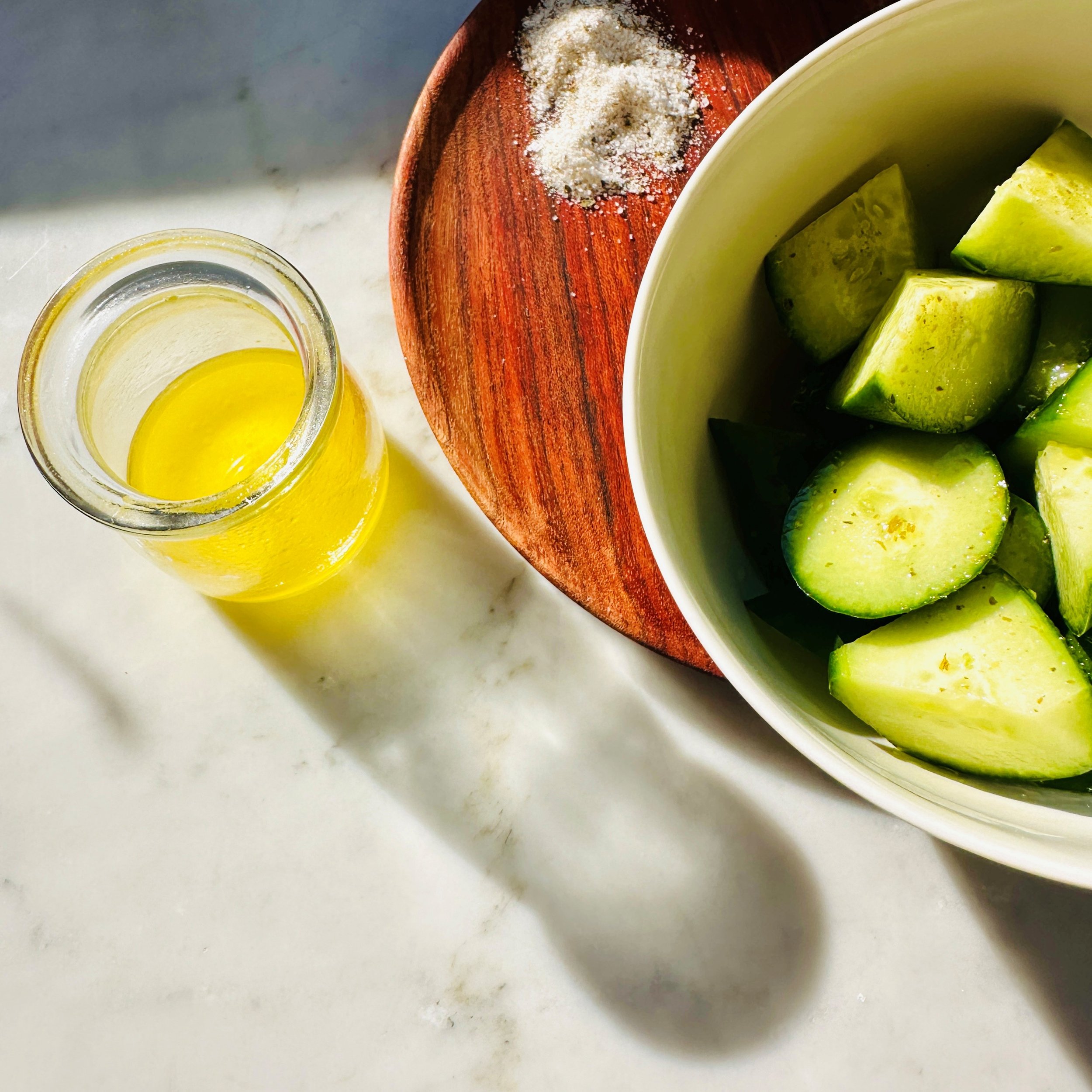 This a light yet rich flavoured dressing that’s wonderful to drizzle over a leafy green salad, or tomato salad, or a sliced cucumber as pictured with wakame salt sprinkled over.